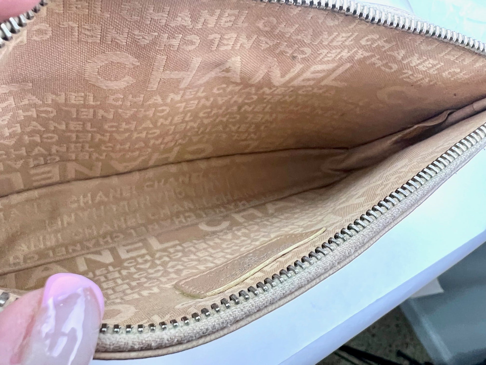 INTERIOR: monogram beige Chanel fabric,