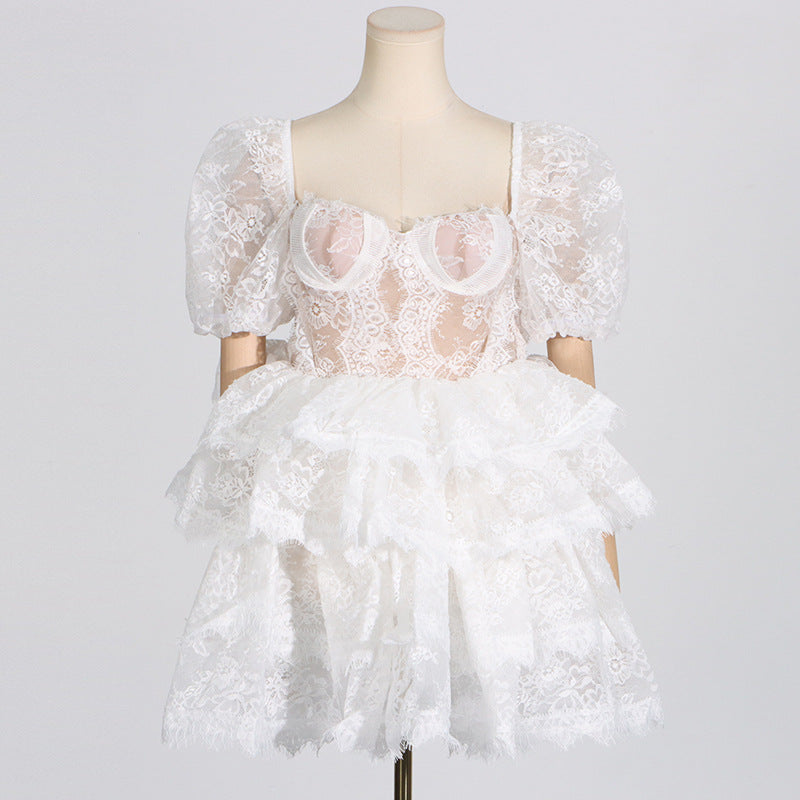 Handmade Lace Sweetheart Neck Puff-Sleeve High-Waist Mini Dress – Romantic Party Look