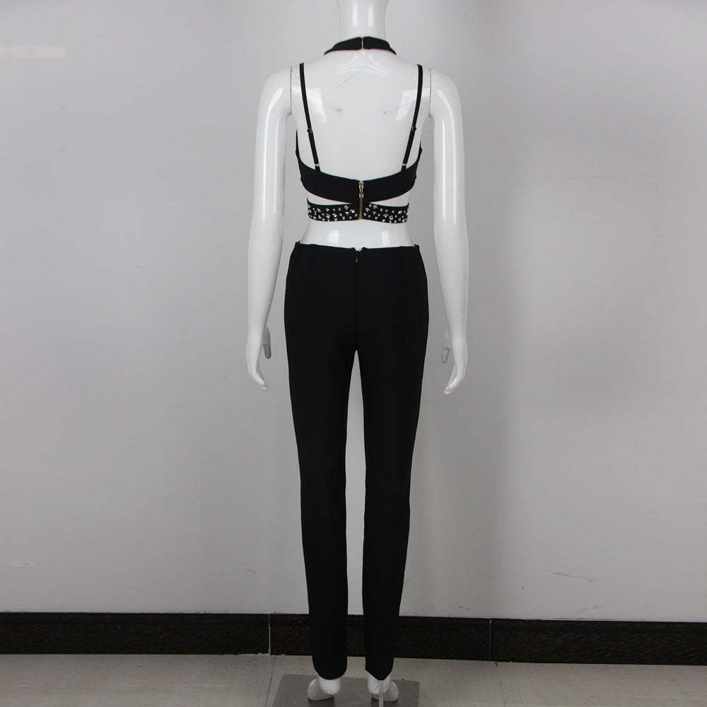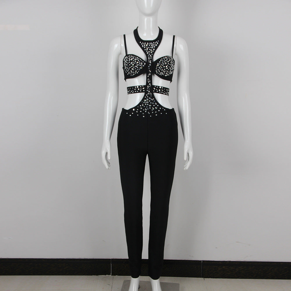 Sexy Halter Hollow Out Cutout Sexy Slim Fit Rhinestone Jumpsuit