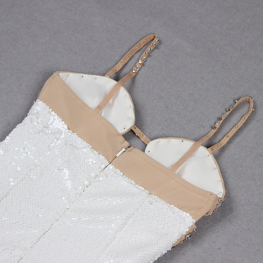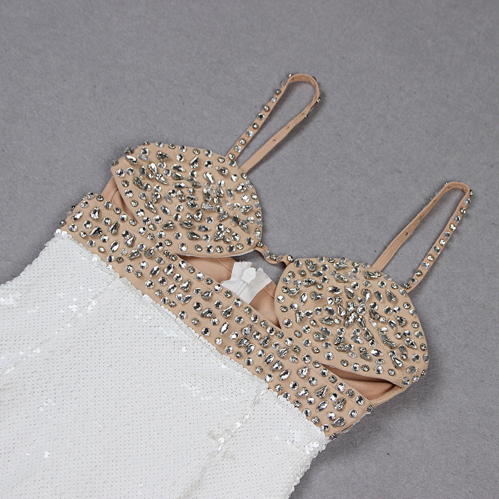 High End White Midi Sequin Dress with Rhinestone Bustier & Cut-Out Detail – Luxury Evening Look
